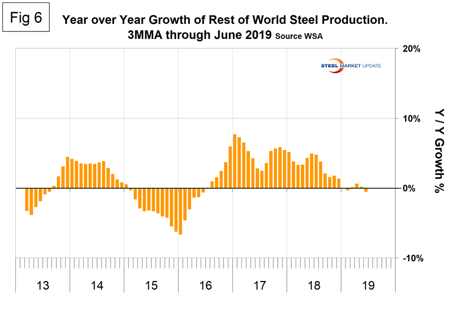 Figure 5 shows the growth of China’s steel production since January 2013 and Figure 6 shows the growth of global steel excluding China. China’s domination of the global steel market is increasing and in each month April, May and June for the first time had an annualized production rate of over one billion metric tons. The WSA is forecasting a deceleration in China’s steel production growth in 2019. The chairman of the World Steel economics committee stated recently that China is expected to experience zero growth in 2019, down from 6 percent in 2018. This is partly a result of trade tensions with the U.S. Five months into 2019, it is now obvious that this was an extraordinarily bad conclusion.