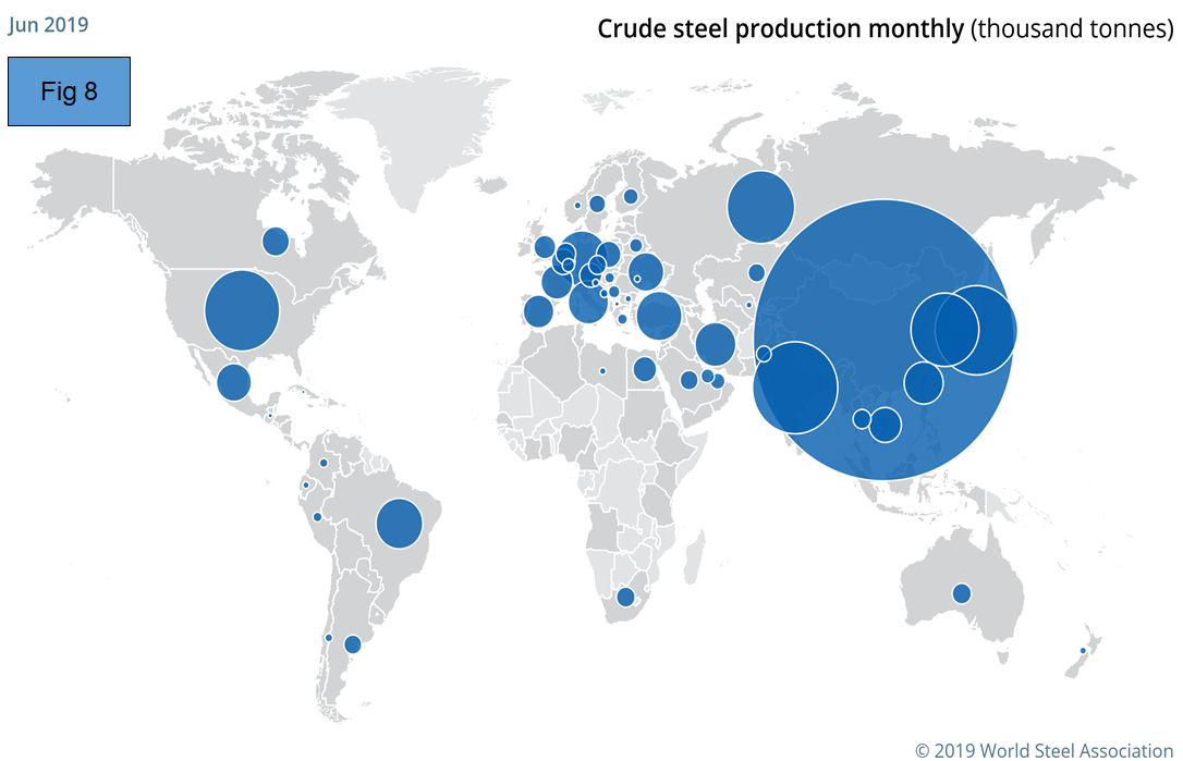 We have developed a new chart this month, presented as Figure 7. This shows the growth of China’s share of global steel production, which in June exceeded 55.0 percent for the first time in history.