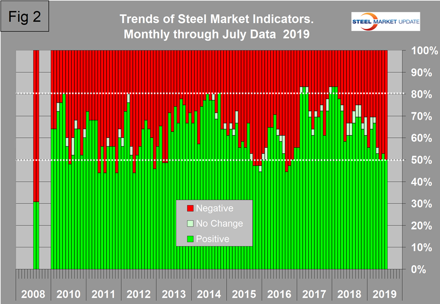 Our view of the July data is that the number of indicators we regard as strong has been hovering around 50 percent for the last four months with only 17 percent being weak. The balance, 33 percent, are in the historical mid-range (normal). Figure 1 shows the history of our view of the present situation data since January 2010 on a percentage basis, and on the far left of the chart is the August 2008 situation immediately before the recession struck the steel business in September that year. Our view of the July data is that of the 36 indicators, 18 are currently positive, 12 are normal and six are negative. This was a decrease of two in the number of indicators that we consider normal, and an increase of one negative and one positive since our June update. Our intent in using the word normal is to say that this indicator is in the mid-range of historical data. Since the end of June, our view of growth of GDP in the U.S. changed from positive to normal based on the first estimate for the second quarter of 2019. Data for the Chicago Fed National Activity Index flipped back from normal to negative, which is where it was in May. In the sheet and strip section of Table 1, both shipments and import market share improved from normal to positive. There were no changes in the raw materials, the long products steel section or in the construction and manufacturing sections.