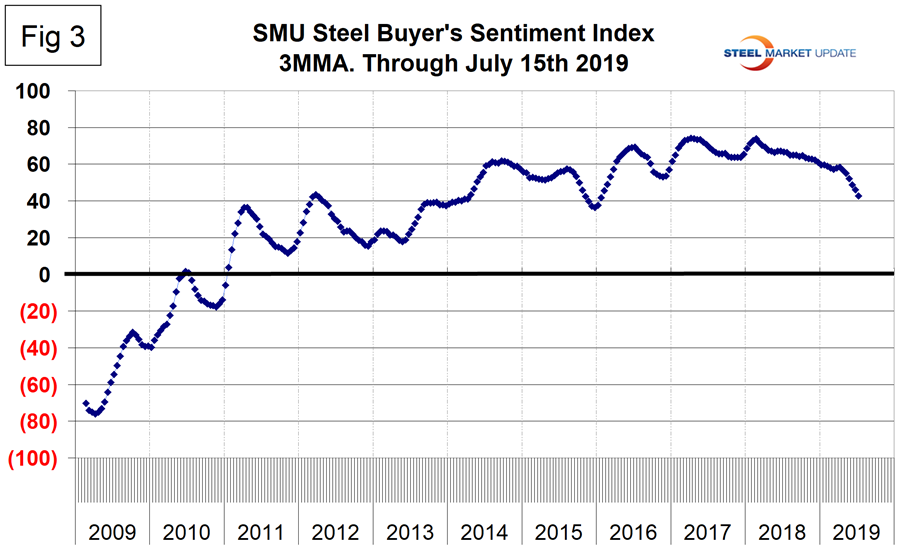 As a reality check for this report, we include here Figure 3, which is SMU’s Steel Buyers Sentiment Index. Readings are developed during the twice monthly SMU market surveys. SMU Steel Buyers Sentiment is a measure of the current attitude of North American buyers and sellers of flat rolled products regarding their company’s opportunity for success in today’s market. A reading above the neutral point of zero indicates that a preponderance of buyers have a positive attitude. The index has been deteriorating since mid-February last year. The mid-July value was still positive 42.7, but down from a peak of 73.8 in February 2018.
