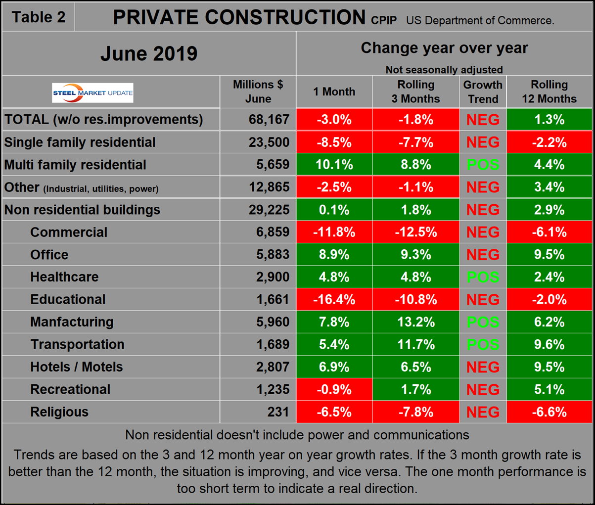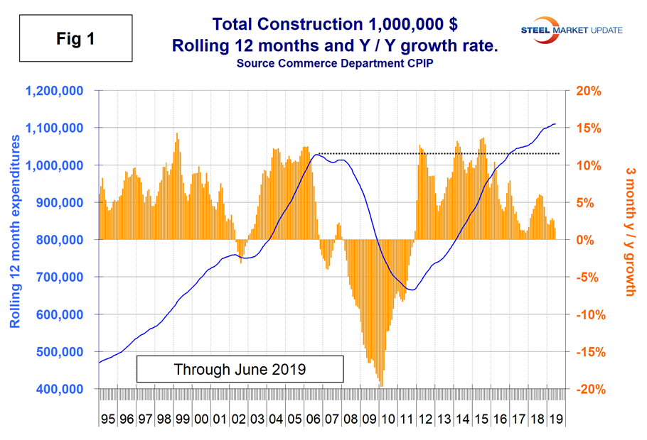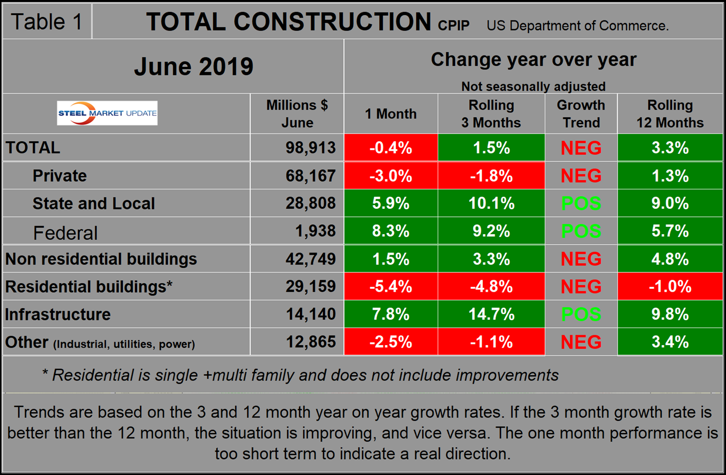 The official CPIP press release gives no appreciation of trends on a historical basis and merely compares the current month with the previous one on a seasonally adjusted basis. The background data is provided as both seasonally adjusted and non-adjusted. The detail is hidden in the published tables, which SMU tracks and dissects to provide a long-term perspective. Our intent is to provide a route map for those subscribers who are dependent on this industry to “follow the money.” This is a very broad and complex subject, therefore to make this monthly write-up more comprehensible, we are keeping the information format as consistent as possible. In our opinion, the absolute value of the dollar expenditures presented are of little interest. What we are after is the magnitude of growth or contraction of the various sectors. In the SMU analysis, we consider only the non-seasonally adjusted data. We eliminate seasonal effects by comparing rolling three-month expenditures year over year. CPIP data also includes the category of residential improvements, which we have removed from our analysis because such expenditures are minor consumers of steel.