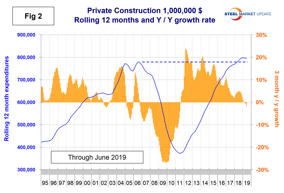 Table 2 shows the breakdown of private expenditures into residential and nonresidential and subsectors of both. The growth rate of private construction in three months through June 2019 was negative 1.8 percent, down from positive 4.8 percent in three months through June last year. Growth has declined continuously in every one of those months as shown by the brown bars in Figure 2. April, May and June were the first months for private construction to experience negative growth since July 2011.