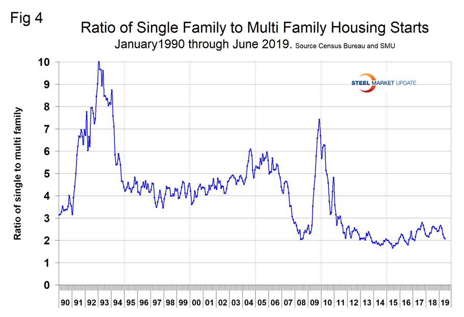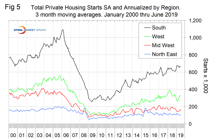 Excluding property improvements, single-family residential contracted by 7.7 percent in three months through June with negative momentum and multifamily residential grew by 8.8 percent with positive momentum. Total housing starts, as reported by Census Bureau, have been contracting on a year-over-year basis since October last year. The National Association of Home Builders optimism index improved in each of the months January through May this year and was stable in June and July, which conflicts with the negative data for CPIP and starts. The Census Bureau reports on construction starts in its housing analysis. In the starts data, the whole project is entered into the database when ground is broken. Construction put in place is based on spending work as it proceeds; the value of a project is spread out from the project’s start to its completion. Single-family starts declined by 6.0 percent in the three months through June year over year, which was about the same as the contraction rate of CPIP. Multifamily starts expanded by 15.2 percent, which was better than the rate of expansion indicated by the CPIP data. Figure 3 shows the growth of both housing sectors since January 2005 and Figure 4 shows the ratio of single-family to multifamily starts. The proportion of single-family gradually increased from January 2015 when the ratio was 1.66 in favor of single units to 2.66 in February before declining to 2.07 in June 2019. Figure 5 shows total housing starts in four regions with the South being the strongest and the Northeast the weakest.