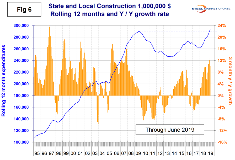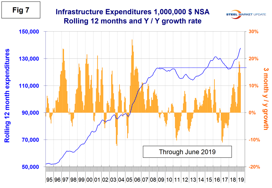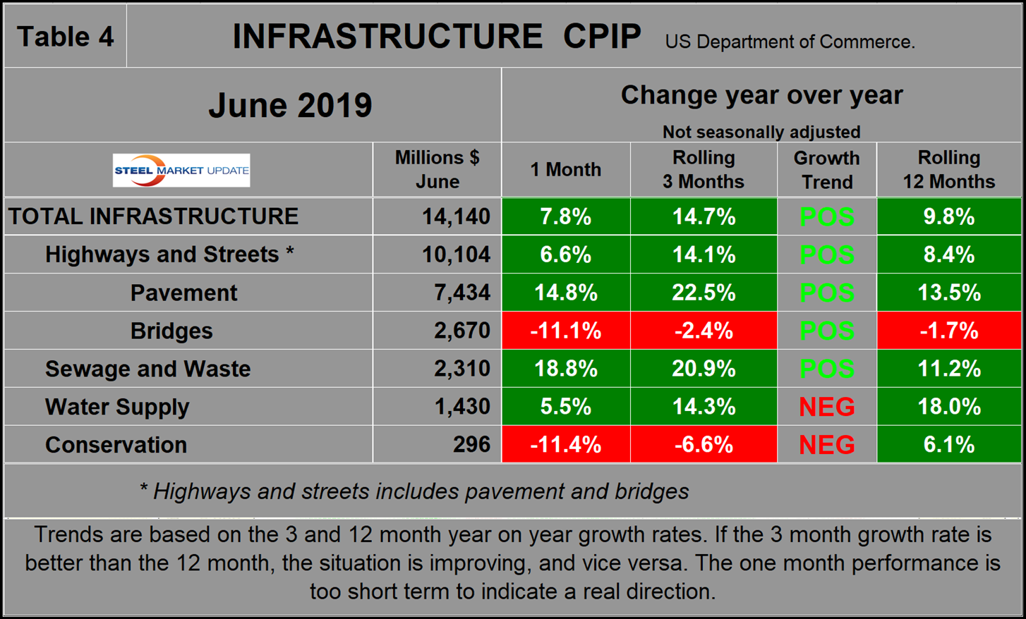 Infrastructure expenditures have had very robust growth in 2019. Year over year, the growth of infrastructure expenditures in three months through June was 14.7 percent with double-digit expansion in each of the last four months of data. On a rolling 12 months basis, infrastructure expenditures in June were at an all-time high. (Note: This is not seasonal as we are considering year over year data.) Highways and streets including pavement and bridges account for about two-thirds of total infrastructure expenditures. Highway pavement is the main subcomponent of highways and streets and had a 22.5 percent growth in three months through June. Bridge expenditures had negative growth in September through January, improved to positive 8.3 percent in March before declining to negative 2.4 percent in this latest data for June (Table 4).