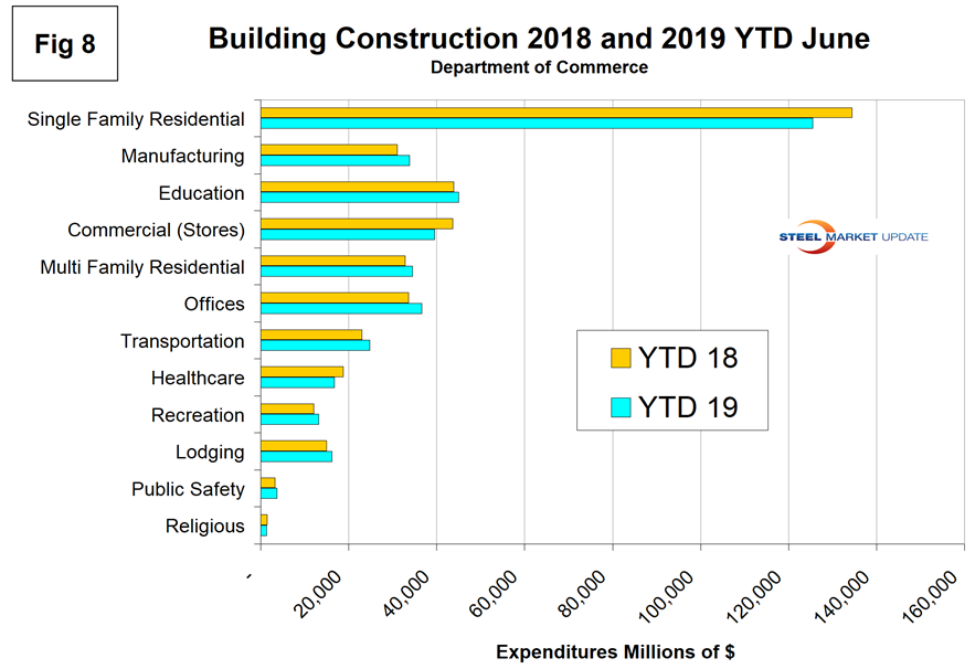 Figure 8 compares year-to-date expenditures for the construction of the various building sectors for 2018 and 2019. Single-family residential is dominant and in the 12 months of 2018 totaled $281.8 billion. In the first six months of 2019, the annual rate of expenditures was $250.9 billion.