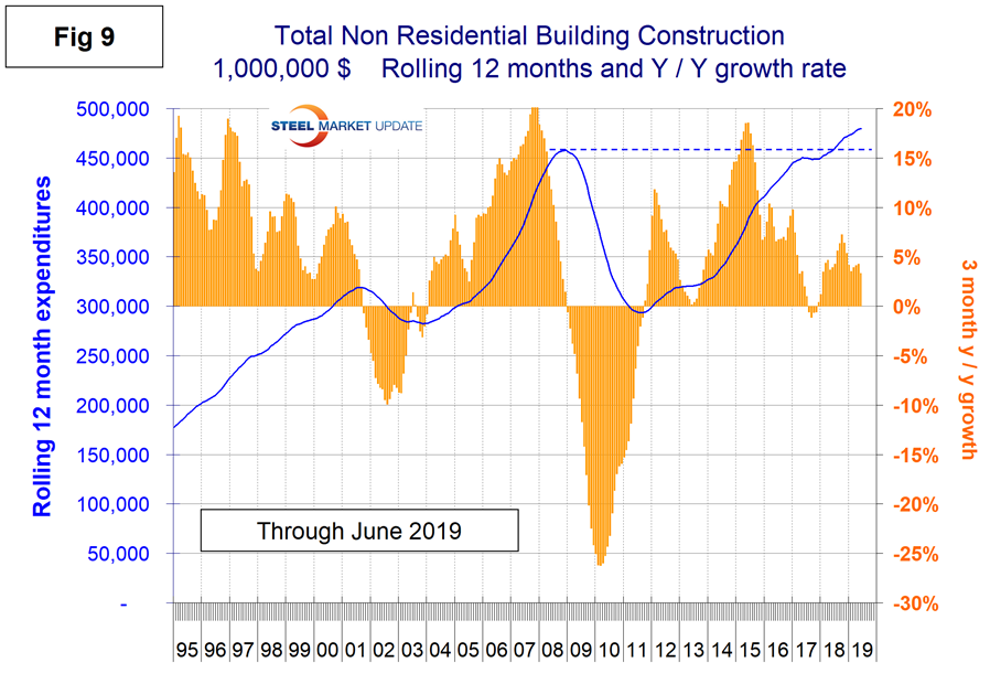 Figure 9 shows total expenditures and growth of nonresidential building construction. On a rolling 12 months basis, expenditures on nonresidential buildings including both private and S&L are at an all-time high and growth has been in the 5 percent range for a year and a half.