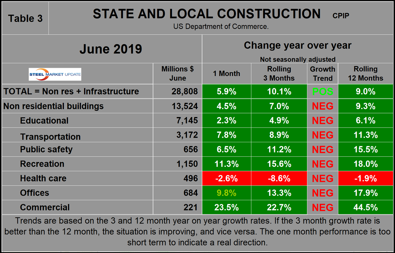 Construction Put in Place (CPIP) expenditures data for June was released on Aug. 1. Through June, total construction has had negative momentum every month since October last year. This was entirely a result of contracting privately funded work. Infrastructure and state and locally funded projects are booming, according to Steel Market Update’s analysis of Commerce Department data