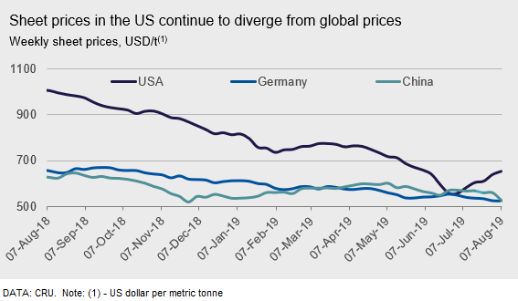 Chinese sheet prices started to fall this week following bleak demand and bearish sentiment. On one hand, sheet demand was hurt by weakening manufacturing performance with steel PMI dropping by 0.3 point in July to 47.9. On the other hand, market sentiment was also hit after Trump’s punitive tariffs on another $300 billion in Chinese goods escalated the U.S.-China trade tension. Steel and iron ore futures have plummeted since then, triggering similar movement in the spot market, although transactions have remained limited. In addition, participants were also concerned about a significant loosening of supply restrictions as the upgraded policy this year might make exemptions from production cuts for those producers who met ultra-low emission targets. However, we do not expect a significant loosening of supply restrictions, because steel mills with better emission results that produce higher-end products were granted permission to produce as normal in the past winter period and it should be similar this year. Though with stricter emission targets being set, we expect the amount of these exemptions to be less than in the past. Therefore, we believe the current price correction will be short-lived and the market will return to supply/demand driven trajectory in the coming weeks.