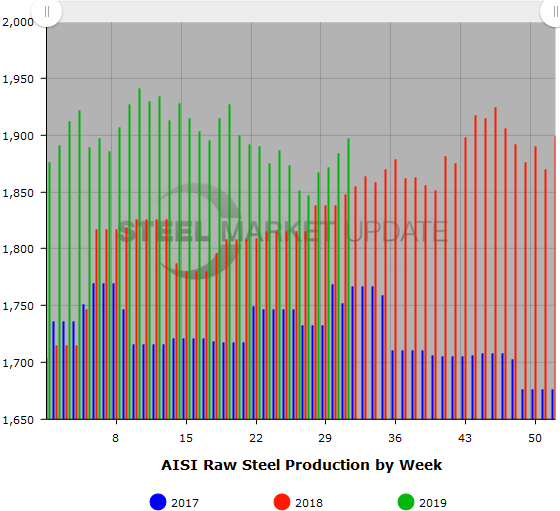 Domestic steelmakers have produced 57,945,000 tons for the year to date, a 4.8 percent increase compared with the same period in 2018. Mill utilization has averaged 81.1 percent so far this year, up from 77.0 percent last year.