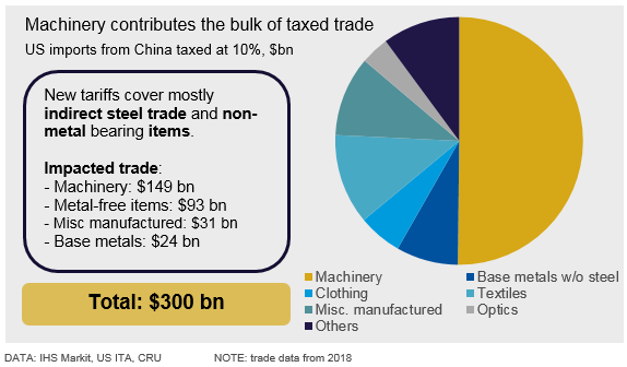 On Friday, Aug. 2, the U.S. government announced 10 percent tariffs on an additional $300 billion in Chinese imports that are not already covered by Section 301 (S301) tariffs. About 50 percent of the new tariffs cover steel-bearing machinery, while the rest are non-steel-containing items such as food, clothing, base metals and optics. The new tariffs will have a negligible direct impact on the Chinese steel industry, but broader consequences are a downside risk.