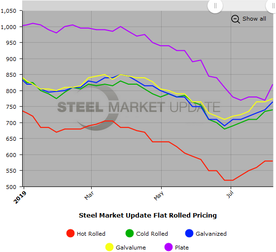 SMU Note: Below is a graphic showing our hot rolled, cold rolled, galvanized, Galvalume and plate price history. This data is available here on our website with our interactive pricing tool. Note that plate prices are not yet available on our website, but we are in the process of adding that dataset. If you need help navigating the website or need to know your login information, contact us at info@SteelMarketUpdate.com or 800-432-3475.