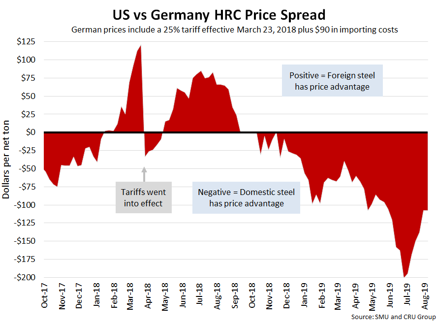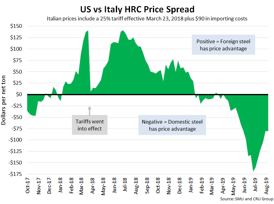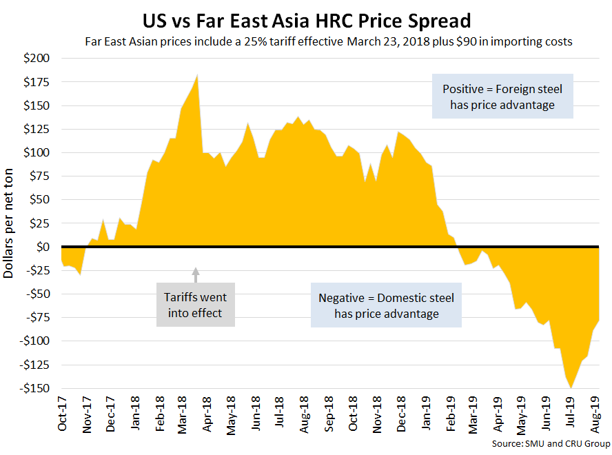 SMU now includes a 25 percent import tariff in our foreign vs. domestic price calculations, effective on foreign prices after March 23, 2018. We then add $90 per ton to the foreign prices in consideration of freight costs, handling, trader margin, etc. This provides an approximate “CIF U.S. ports price” that can then be compared against the SMU U.S. hot rolled price. The difference between the domestic and foreign hot rolled prices is then referred to as the “price spread.” As the price spread narrows, the competitiveness of imported steel into the United States is reduced. If the spread widens, then foreign steel becomes more attractive to U.S. flat rolled steel buyers. A positive spread means foreign steel has a price advantage (U.S. prices are higher than foreign prices), while a negative spread means domestic steel has a price advantage (U.S. prices are less than foreign prices). Note that we do not include any anti-dumping (AD) or countervailing duties (CVD) in this analysis.