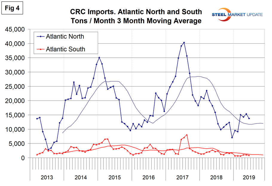 Figures 3, 4, 5 and 6 show the history of CRC coil imports by region since March 2013 on a three-month moving average basis. Note, the Y axis scales are not the same.