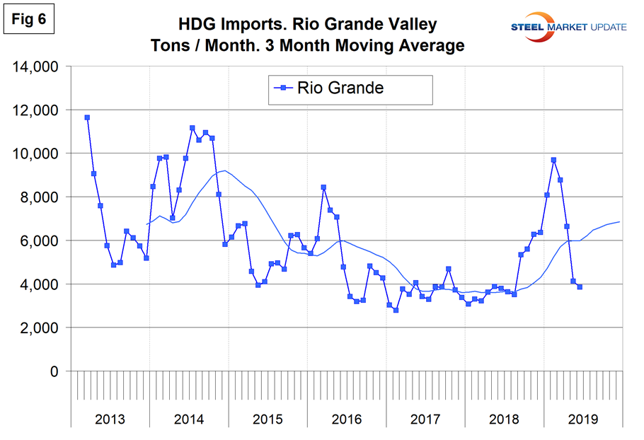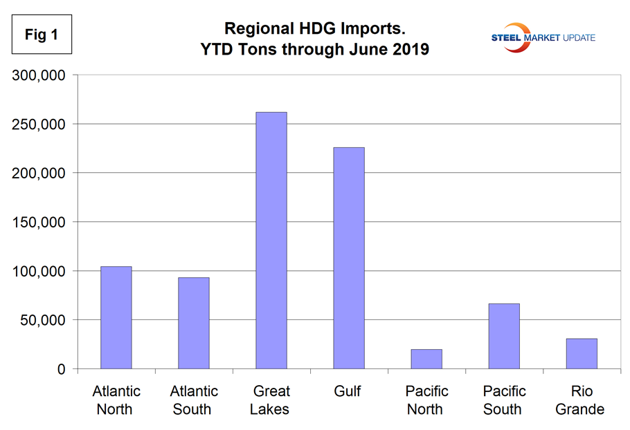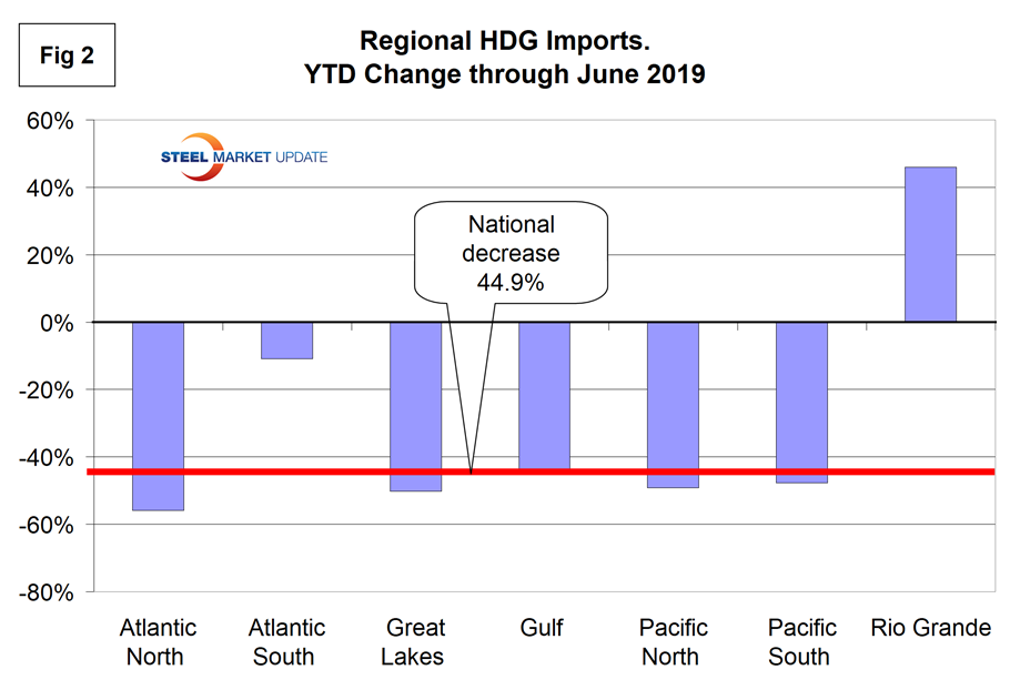 Year to date, June, total hot dipped galvanized imports were down by 44.9 percent. All regions except the Rio Grande were down. The Rio Grande was up by 46 percent.