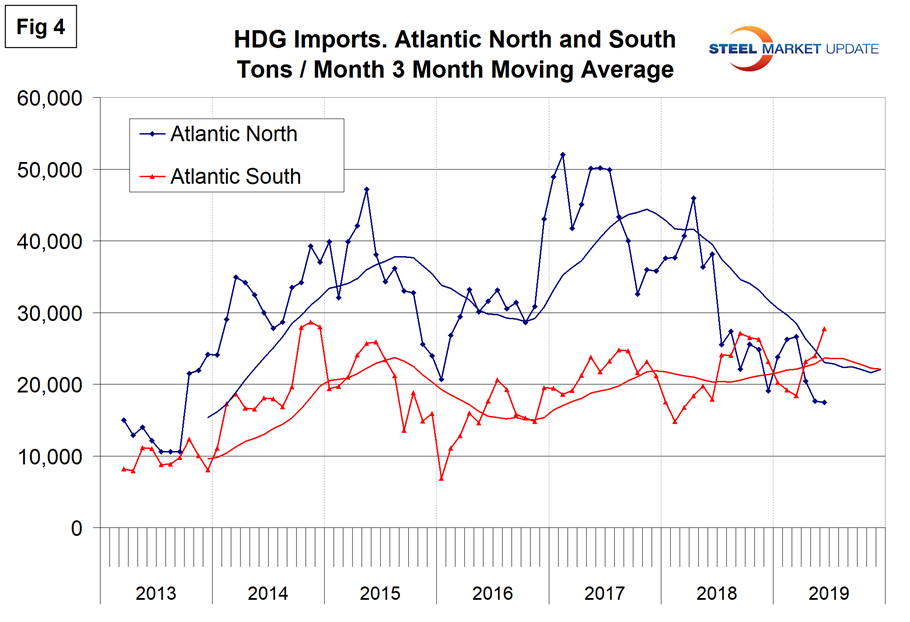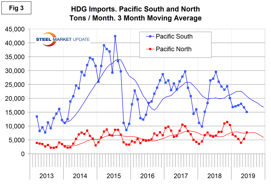 Figures 3, 4, 5 and 6 show the history of HDG coil imports by region since March 2013 on a three-month moving average basis. Note, the Y axis scales are not the same.