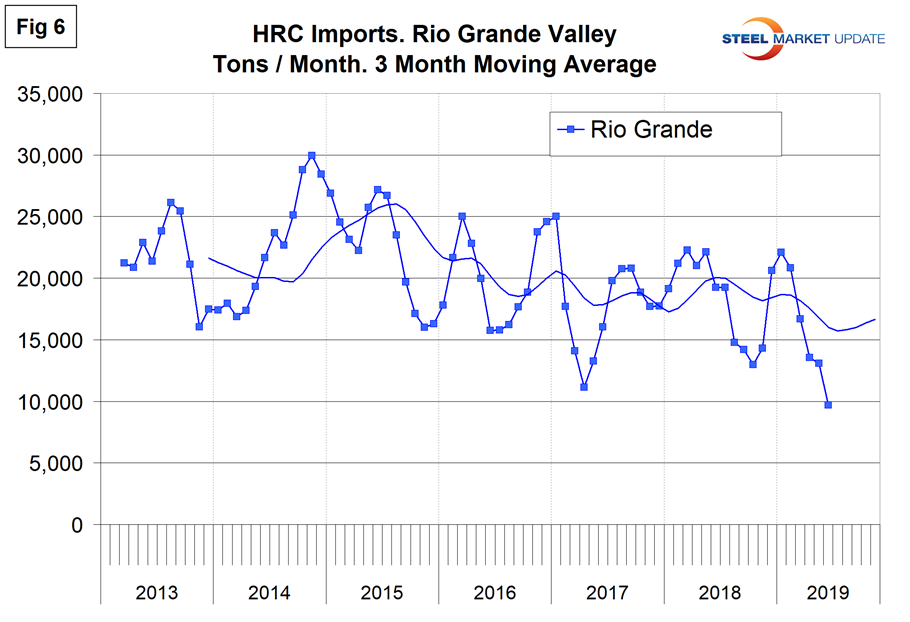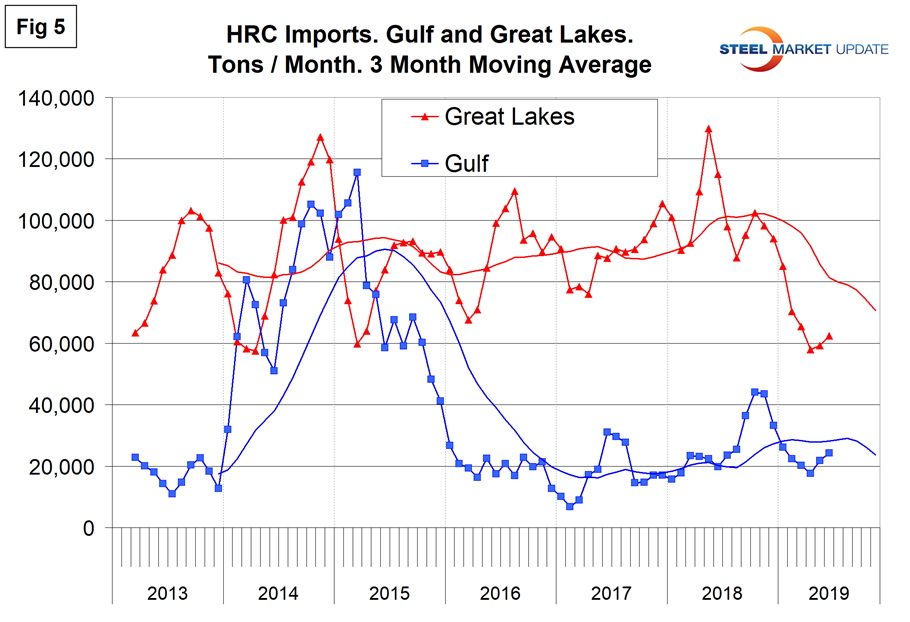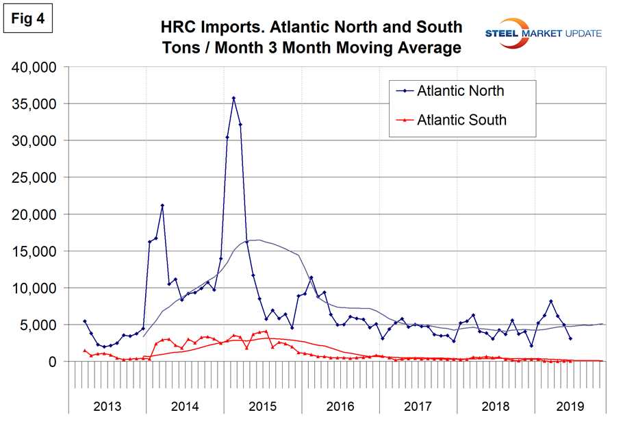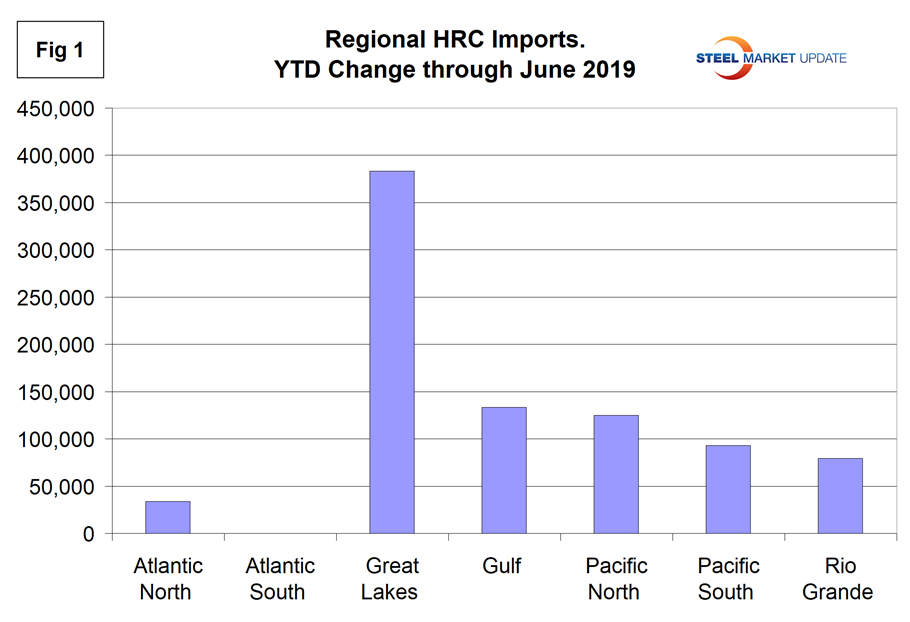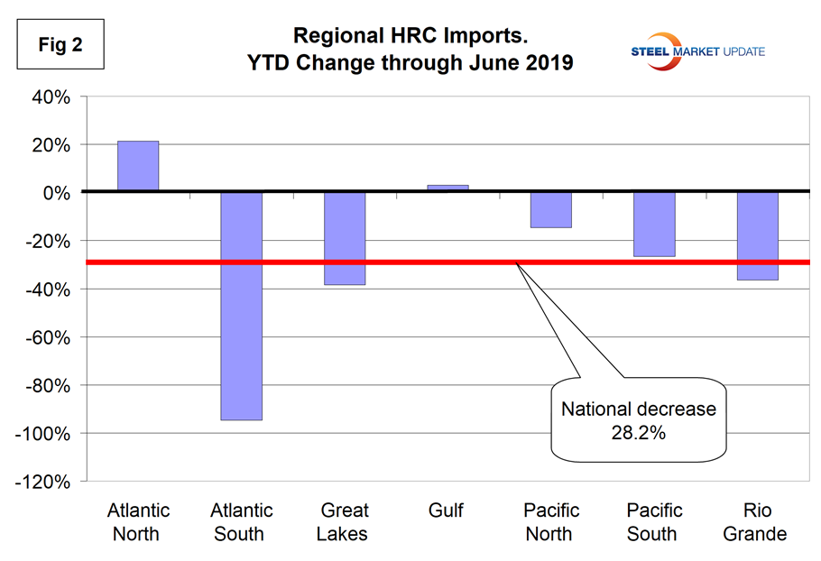 Year to date, June, total hot rolled coil imports were down by 28.2 percent, but the Great Lakes region was down by 38.4 percent and the Atlantic North was up by 21.3 percent.