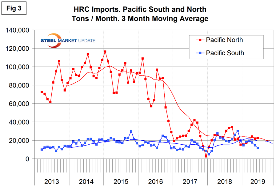 Figures 3, 4, 5 and 6 show the history of HRC coil imports by region since March 2013 on a three-month moving average basis. Note, the Y axis scales are not the same.