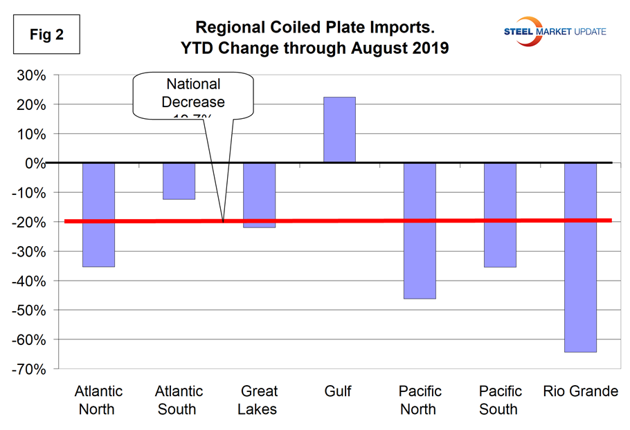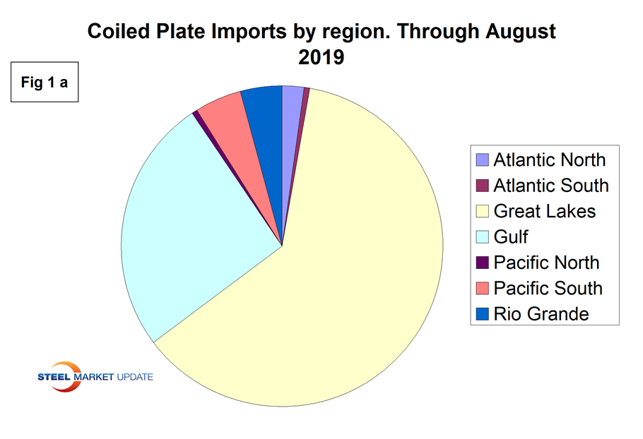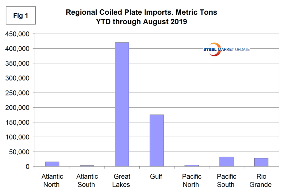 Steel Market Update offers a comprehensive series of import reports ranging from the first look at licensed data to a detailed look at volume by district of entry and source nation. This report, on coiled plate, is designed to plug the gap between the two. We will report data for regional imports for each of six flat rolled products every other month. This month, we are reporting through August. These six reports are intended to be reference documents with very few specific comments. The charts tell the whole story.