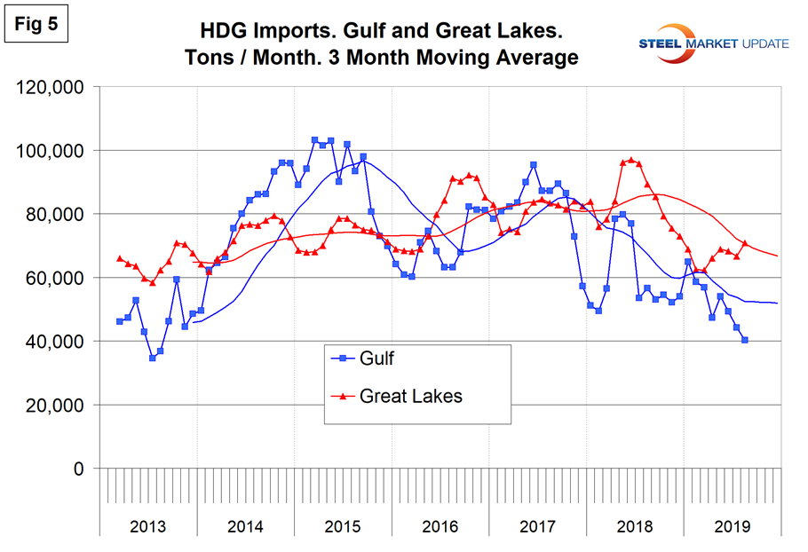 Figures 3, 4, 5 and 6 show the history of HDG sheet imports by region since March 2013 on a three-month moving average basis. Note, the Y axis scales are not the same.