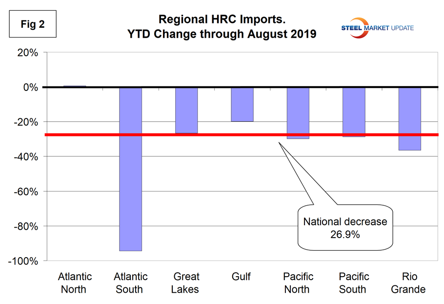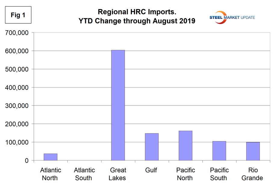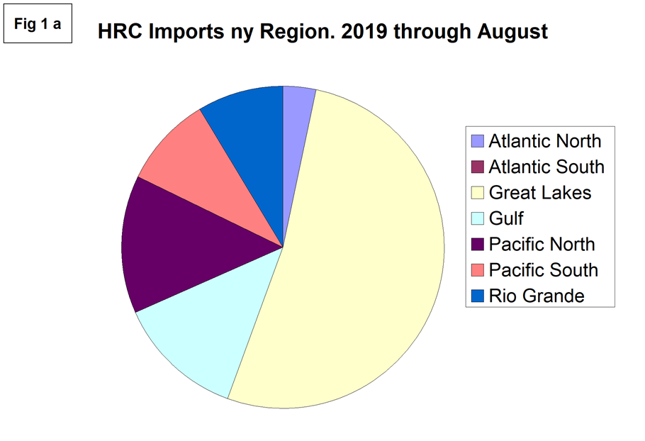 Steel Market Update offers a comprehensive series of import reports ranging from the first look at licensed data to a detailed look at volume by district of entry and source nation. This report, on hot rolled coil, is designed to plug the gap between the two. We will report data for regional imports for each of six flat rolled products every other month. This month we are reporting through August. These six reports are intended to be reference documents with very few specific comments. The charts tell the whole story.