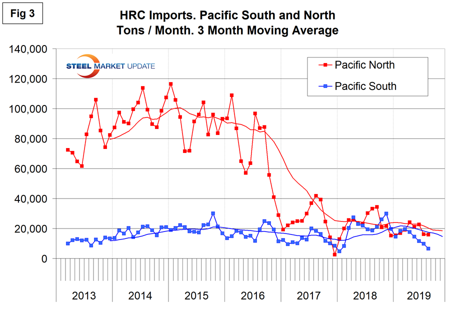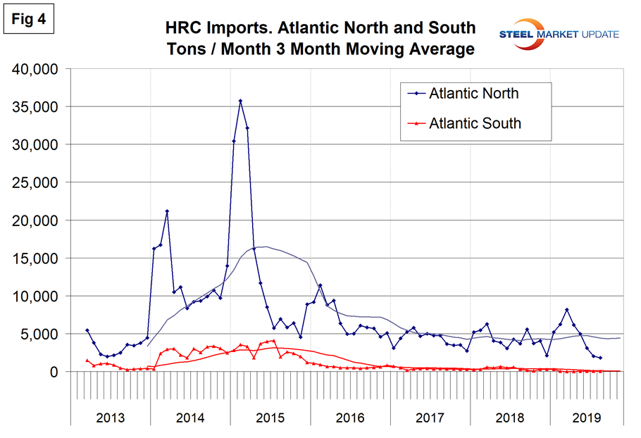 Figures 3, 4, 5 and 6 show the history of HRC imports by region since March 2013 on a three-month moving average basis. Note, the Y axis scales are not the same.