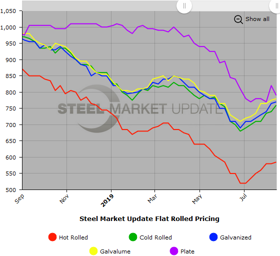 SMU Note: Below is a graphic showing our hot rolled, cold rolled, galvanized, Galvalume and plate price history. This data is available here on our website with our interactive pricing tool. Note that plate prices are not yet available on our website, but we are in the process of adding that dataset. If you need help navigating the website or need to know your login information, contact us at info@SteelMarketUpdate.com or 800-432-3475.
