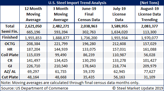Halfway through the month of August, steel import license data is trending down considerably, as expected following a big bump in July. Taking the rate of license requests and extrapolating it out for the entire month, August is on track to see less than 2.1 million tons of total steel imports, down from nearly 3.6 million tons in July.