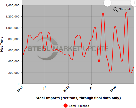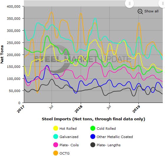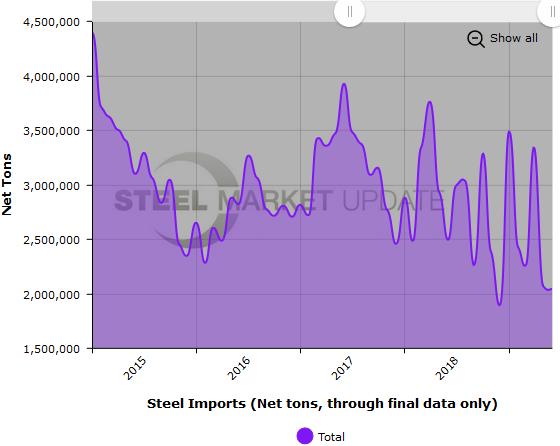 Below are three sample graphs showing the history of foreign steel imports through final June data. You will need to view the graphs on our website to use their interactive features; you can do so by clicking here. If you need assistance logging in to or navigating the website, please contact us at info@SteelMarketUpdate.com.