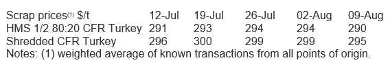 Last week, Turkish scrap prices declined slightly by $4 /t w/w to $290 /t CFR for HMS 80:20, based on one 40 kt deal from the U.S. The Turkish market remains quiet because of the Eid al-Adha (Festival of the Sacrifice) holidays this past week. We consider this new price level of around $285-290 /t to be the baseline for the coming weeks.