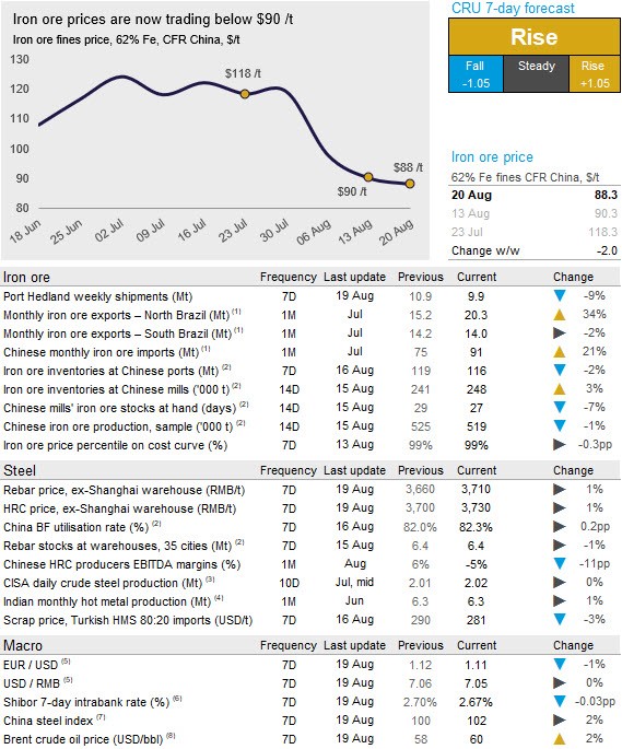 Iron ore prices continued to decline in the past week as margins in the Chinese steel industry continued to decline on weak steel demand and high production levels. On Tuesday, Aug. 20, CRU has assessed the 62% Fe fines price at $88.30 /t, a $2.00 /t decline w/w.