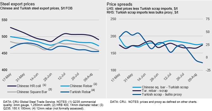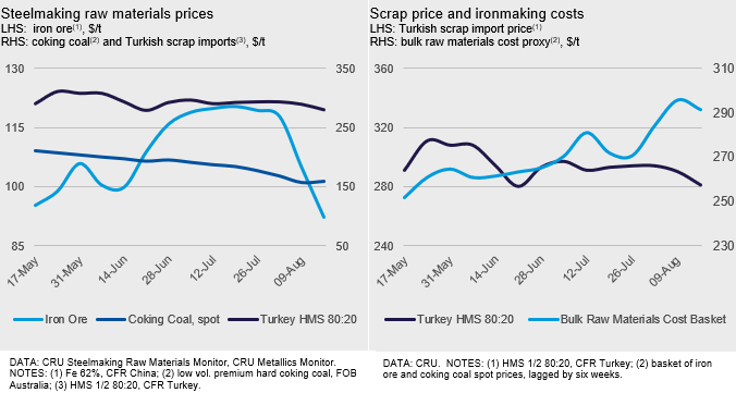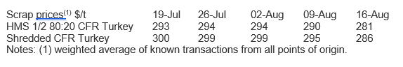 Last week, Turkish scrap prices slid further, dropping by $9 /t w/w to $281 /t CFR for HMS 80:20, based on one 40 kt deal from Europe. This new price level is the lowest level since the brief drop in mid-June and before that the distinct, though brief, weakness last winter. Weaker global steel prices amid iron ore price falls is a key contributor to the recent decline.