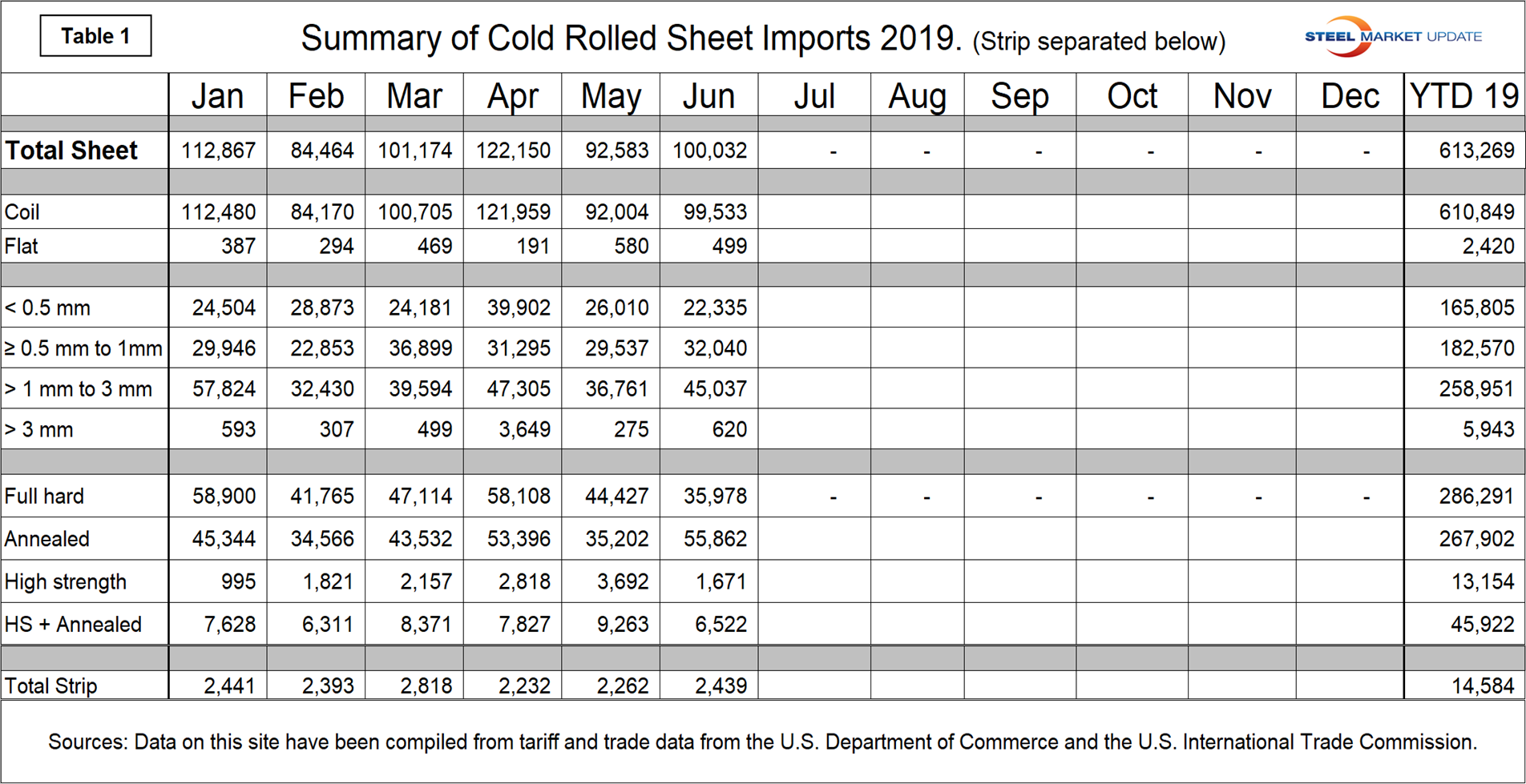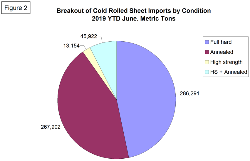Through June 2019, of the total cold rolled sheet and strip imports into the U.S. only 2.3 percent was strip. By gauge range, the sheet broke down to: 27.0 percent < 0.5mm, 29.8 percent ≥ 0.5 to 1.0 mm, 42.2 percent > 1 to 3mm thick and 1.0 percent > 3 mm.
