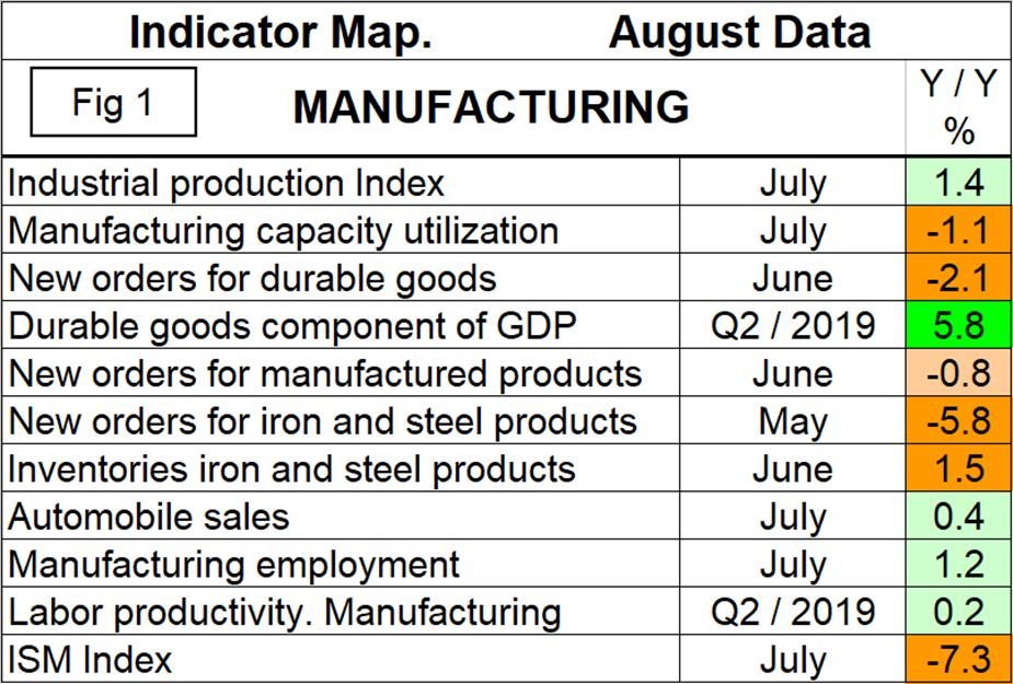 Figure 2 shows the three-month moving average (3MMA) of the IP index since January 2007 as the blue line and the year-over-year growth as the brown bars. March 2017 was the first month of positive growth in the 3MMA since April 2015. Year-over-year growth peaked at 5.8 percent in October of last year and has contracted every month through June when it reached 1.4 percent. The growth rate was unchanged in July at 1.4 percent. Manufacturing capacity utilization improved from 74.48 percent in January 2017 to 77.01 percent in December last year and has declined every month in 2019, reaching 75.3 percent in July with a negative year-over-year growth rate of 1.1 percent on a 3MMA basis (Figure 3).