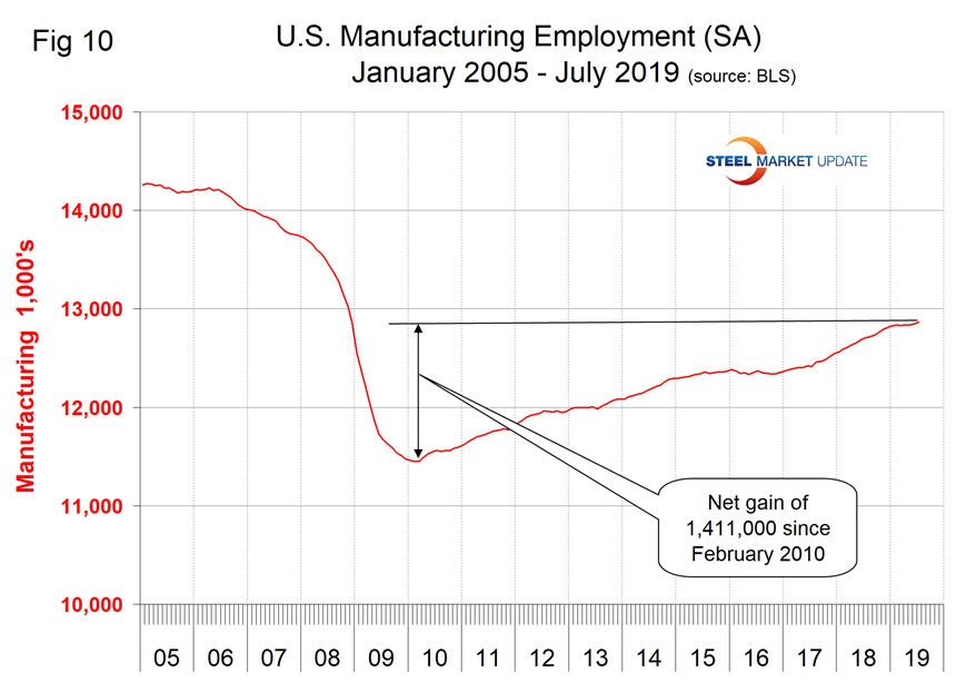Manufacturing employment plummeted during the recession and gradually improved from the spring of 2010 through 2014. Growth was flat in 2015 and declined slightly in 2016 when 23,000 jobs were lost during the year as a whole. There was a turnaround in 2017, and in the 12 months of 2018, 264,000 jobs were created. The annualized rate of manufacturing job creation in the first seven months of 2019 was 132,000, therefore down by almost exactly 50 percent from last year (Figure 10). The motor vehicles and parts subcomponent of manufacturing employment had a net gain of 400 jobs in the first seven months of 2019.
