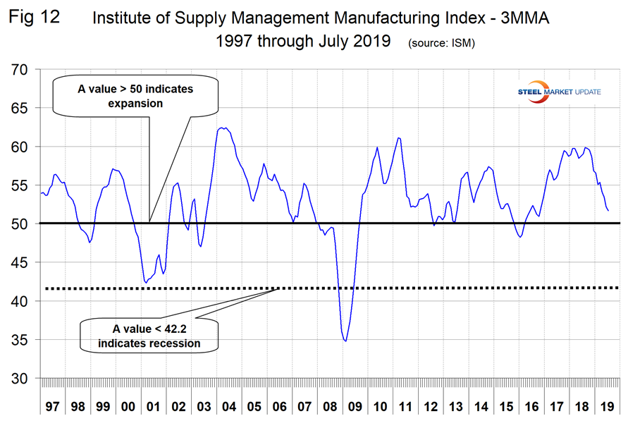 The Institute for Supply Management’s Manufacturing Index is a diffusion index. ISM states: “Diffusion indexes have the properties of leading indicators and are convenient summary measures showing the prevailing direction of change and the scope of change. An index value above 50 indicates that the manufacturing economy is generally expanding; below 50 indicates the opposite.” Figure 12 shows the 3MMA of the ISM index from January 1997 through July 2019. The index surged from January 2016 through October 2017, leveled off through October 2018 and has declined since then. The index had a value of 51.2 in July with a 3MMA of 51.7, down by 7.3 points year over year.