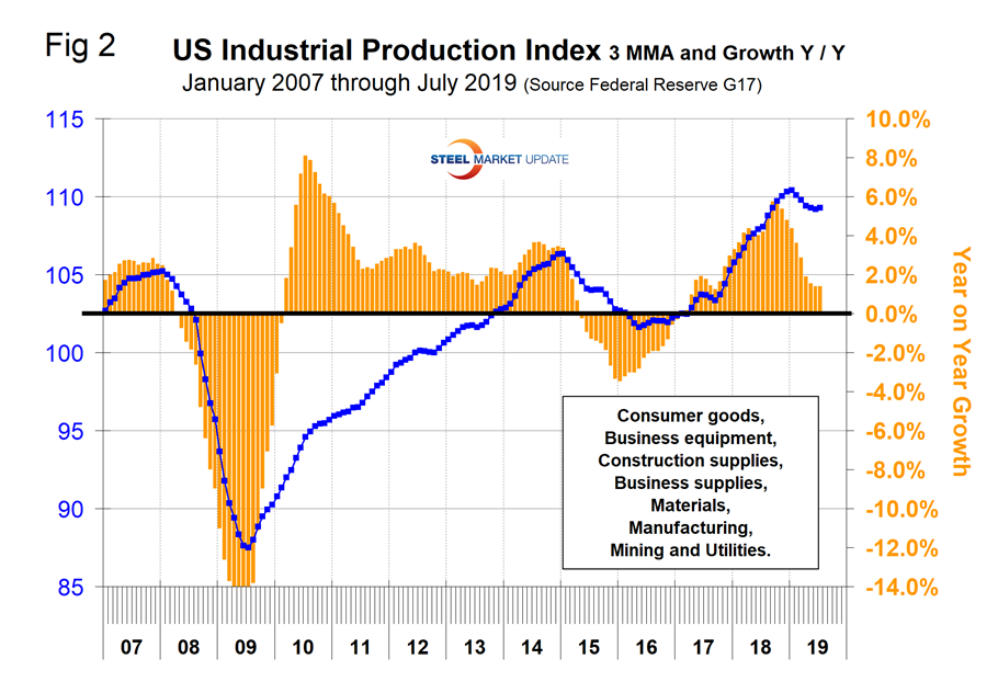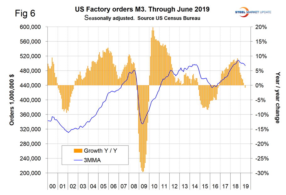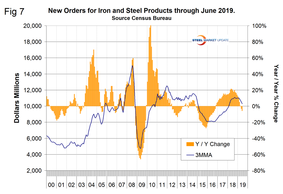 Within the Census Bureau M3 manufacturing survey is a subsection for new orders for iron and steel products. Figure 7 shows the history since January 2000. The year-over-year growth rate has declined every month from 21.6 percent in March last year to negative 5.8 percent in June 2019.