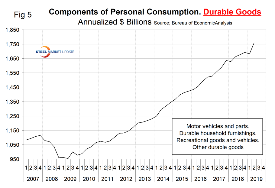 The first estimate of Q2 2019 GDP growth was reported as 2.1 percent annualized, which was down from 3.1 percent in Q1 2019. A subcomponent of the quarterly data is durable goods, which is part of the personal consumption calculation. It therefore contains no military hardware or civil aircraft data. Durable goods in this GDP analysis grew at 5.8 percent year over year in the second quarter as shown in Figure 5 when the annualized total reached $1.759 trillion. Presumably because of the exclusion of military hardware and civil aircraft, Figure 5 looks nothing like Figure 4, but we also think this measure of manufacturing is out of line with the other 10 indicators described here.