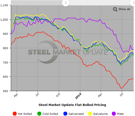 SMU Note: Below is a graphic showing our hot rolled, cold rolled, galvanized, Galvalume and plate price history. This data is available here on our website with our interactive pricing tool. Note that plate prices are not yet available on our website, but we are in the process of adding that dataset. If you need help navigating the website or need to know your login information, contact us at info@SteelMarketUpdate.com or 800-432-3475.