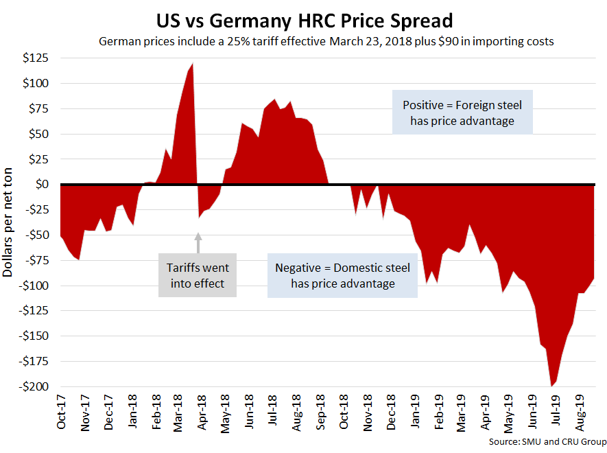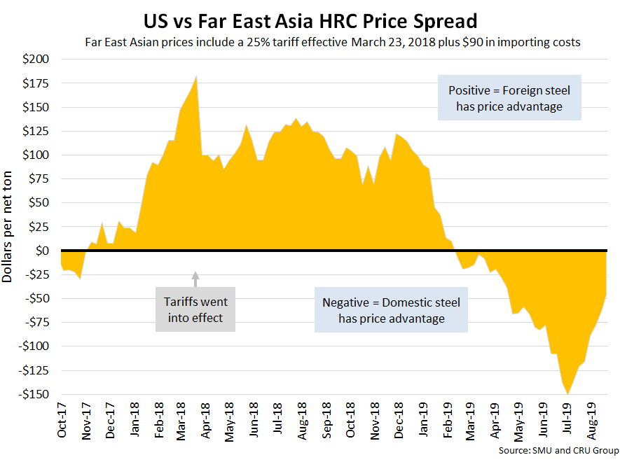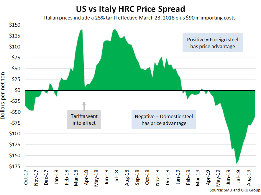 A positive spread means foreign steel has a price advantage (U.S. prices are higher than foreign prices), while a negative spread means domestic steel has a price advantage (U.S. prices are less than foreign prices).