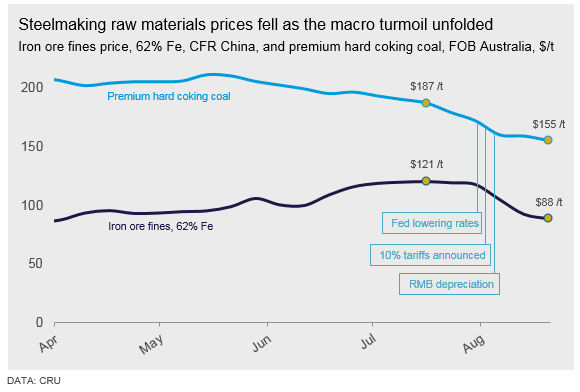 In the past month, we have seen sharp declines in global commodity prices, including steelmaking raw materials. The fall was triggered by an escalation of the U.S.-China trade war, but CRU’s research shows that supply and demand fundamentals in the markets also contributed to recent price falls.