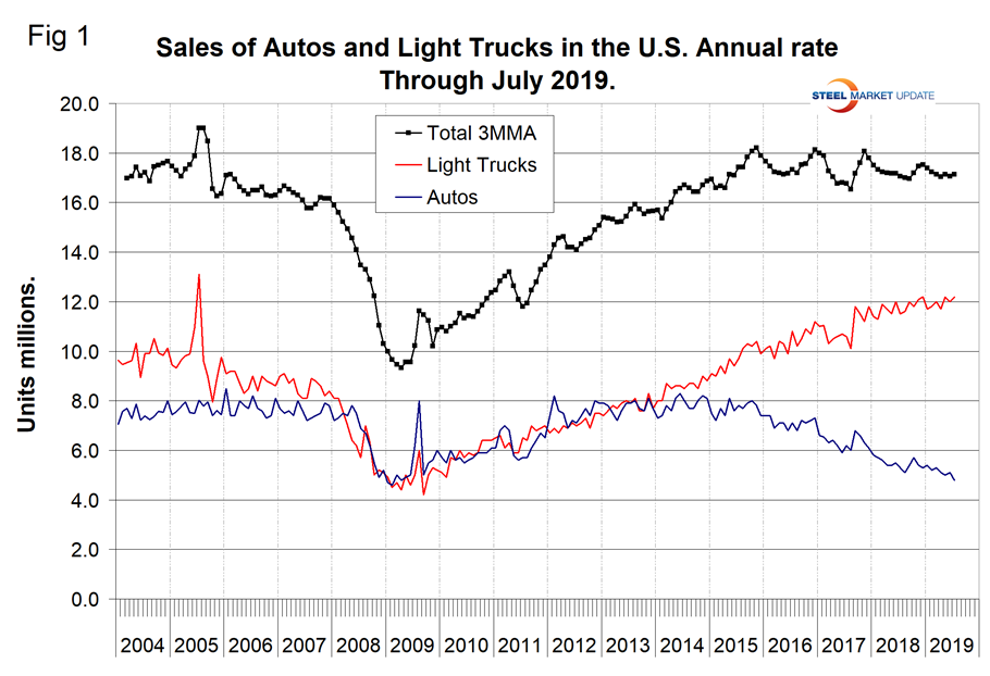 Economy.com summarized July’s vehicle sales as follows: “U.S. unit vehicle sales slowed slightly in July to 17 million annualized units. Light truck and SUV sales fell 1.1 percent to 12.2 million annualized units. Car sales fell 2.7 percent to 4.8 million annualized units. July vehicle sales were slightly above their second-quarter average of 16.9 million annualized units. The lack of volatility in the new vehicle market is indicative of the unwavering confidence of the U.S. consumer. The ongoing trade war and slowing world economy have yet to significantly hold back individuals looking to purchase new vehicles. The consistency over the last few months is not expected to continue throughout the near-to-medium term as the economic expansion reaches its later stages.”