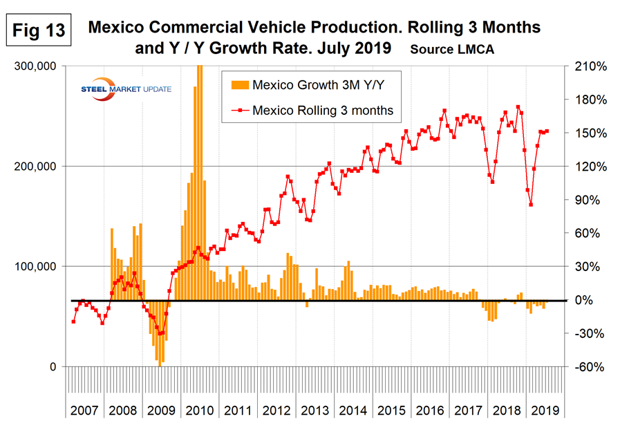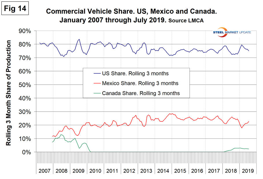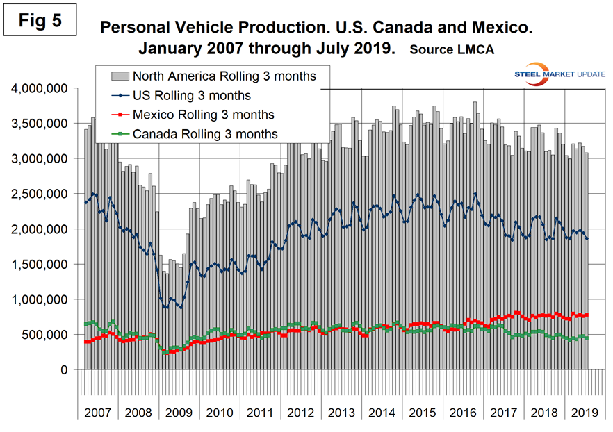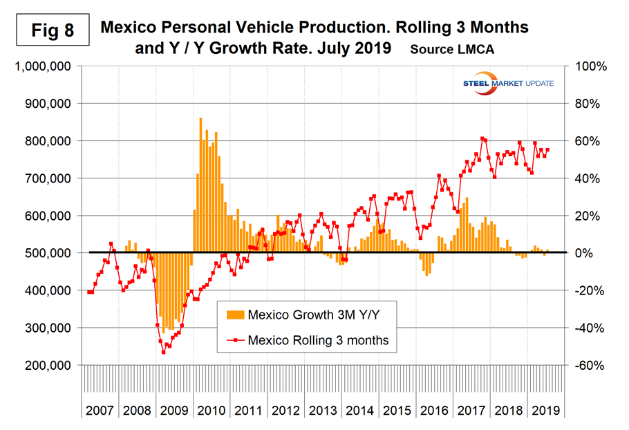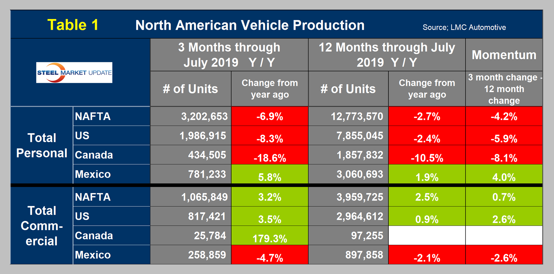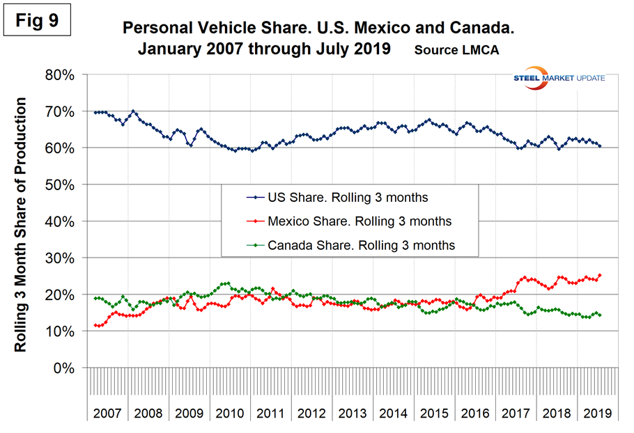 SMU Comment: North America experienced the normal July slowdown in vehicle assemblies. Mexico has been taking share of personal vehicle production but not of commercial vehicles. It remains to be seen whether the renegotiated North American trade agreement will result in a move in production share to the U.S.