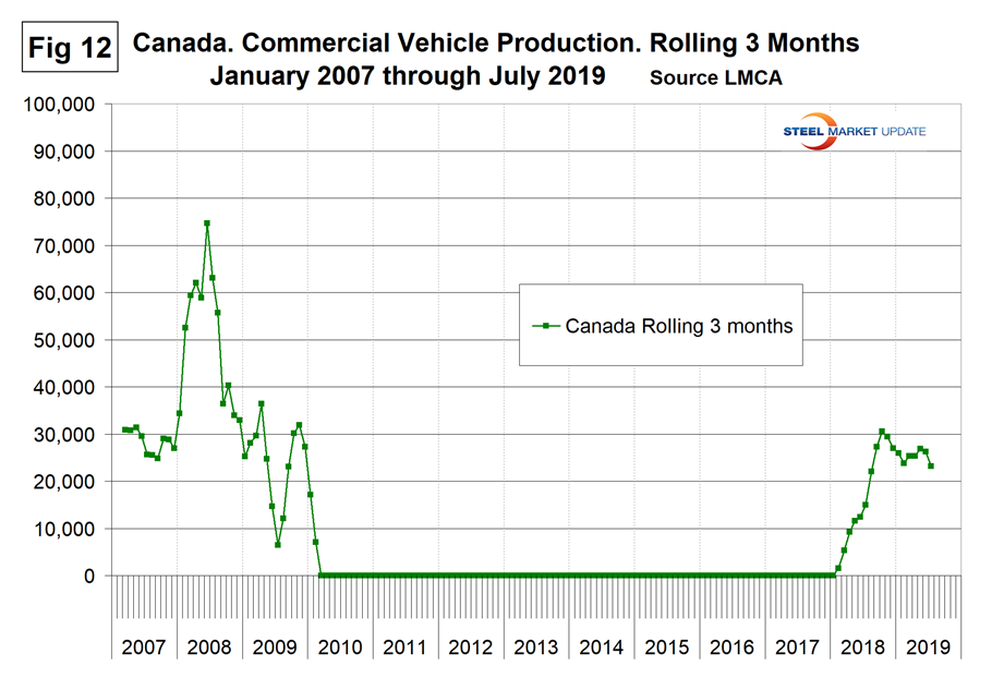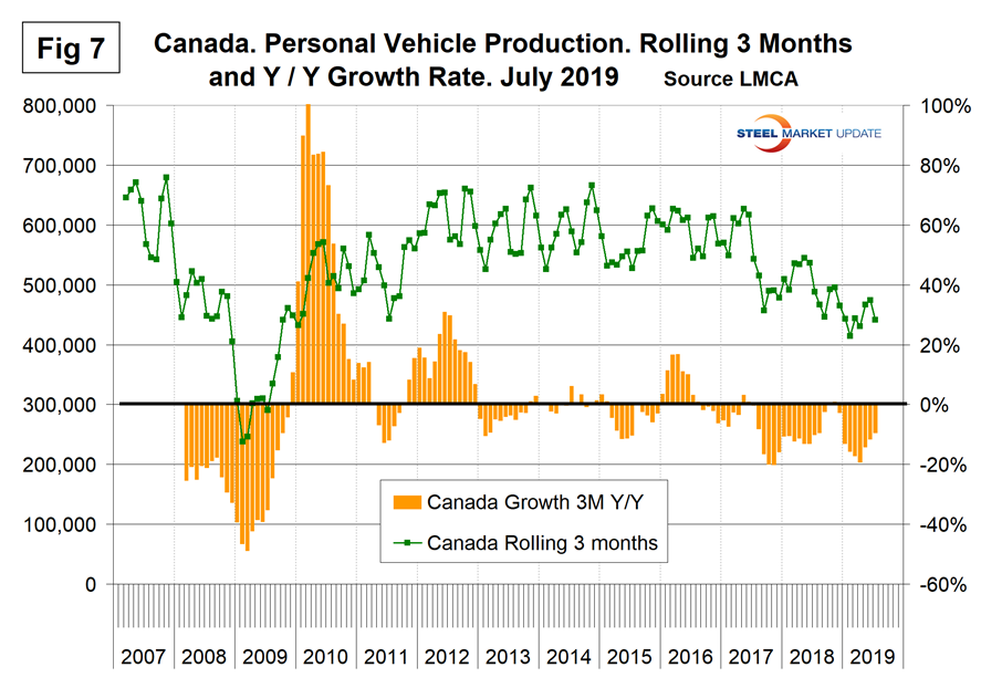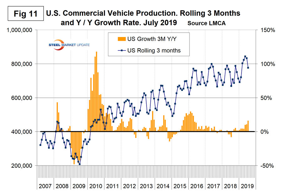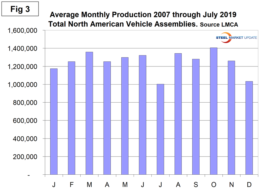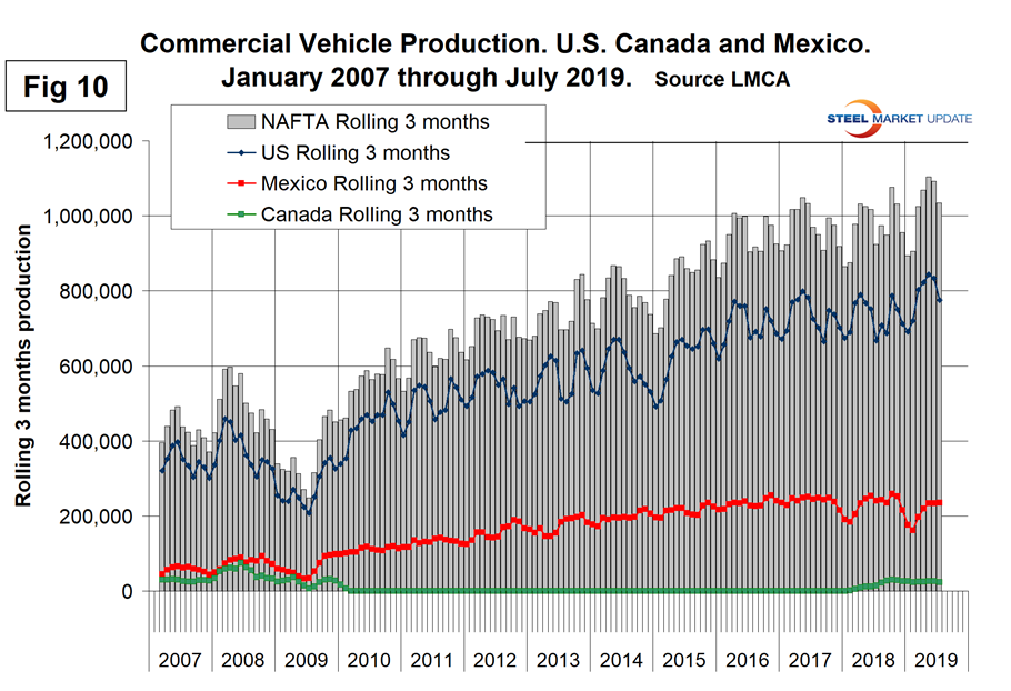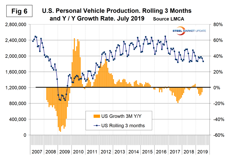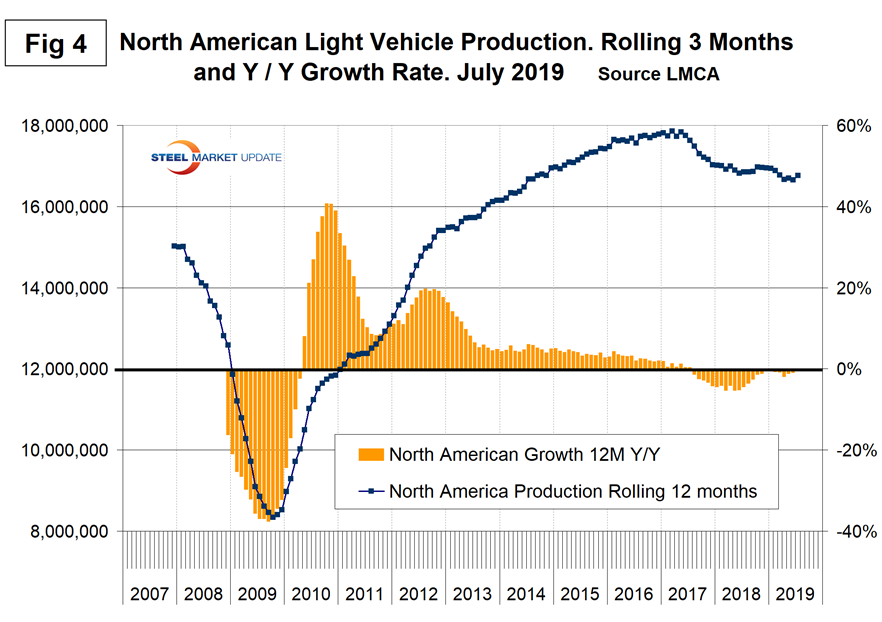SMU Comment: North America experienced the normal July slowdown in vehicle assemblies. Mexico has been taking share of personal vehicle production but not of commercial vehicles. It remains to be seen whether the renegotiated North American trade agreement will result in a move in production share to the U.S.