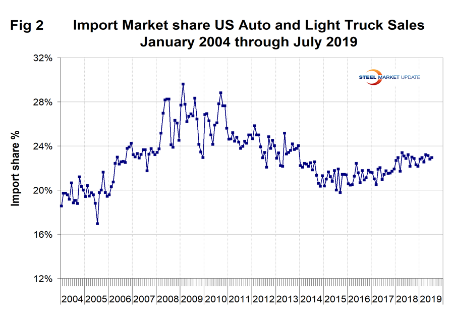 Figure 1 shows auto and light truck sales since January 2004. In July, total sales were up by 0.4 percent on a three-month moving average (3MMA) basis year over year. Light trucks that include pickups, SUVs and crossovers have been surging at the expense of cars for four years. In July, the mix was 71.8 percent light trucks and 28.2 percent autos. May was the first month ever for light trucks to exceed a 70 percent share. In 2019, import market share had a high of 23.2 percent in April, declining to 22.9 percent in July as shown in Figure 2.