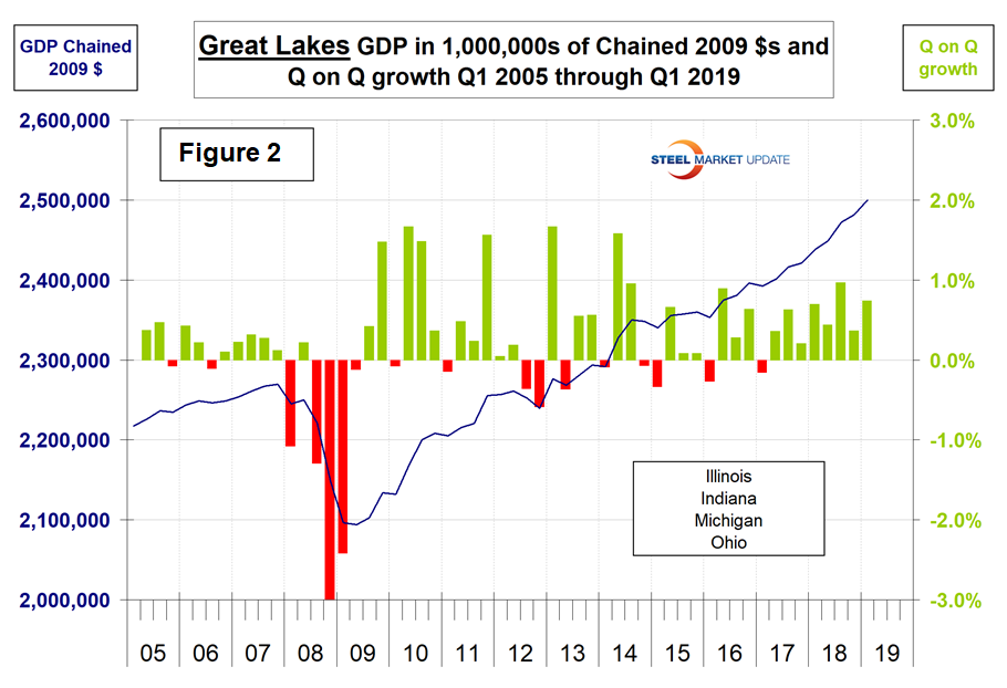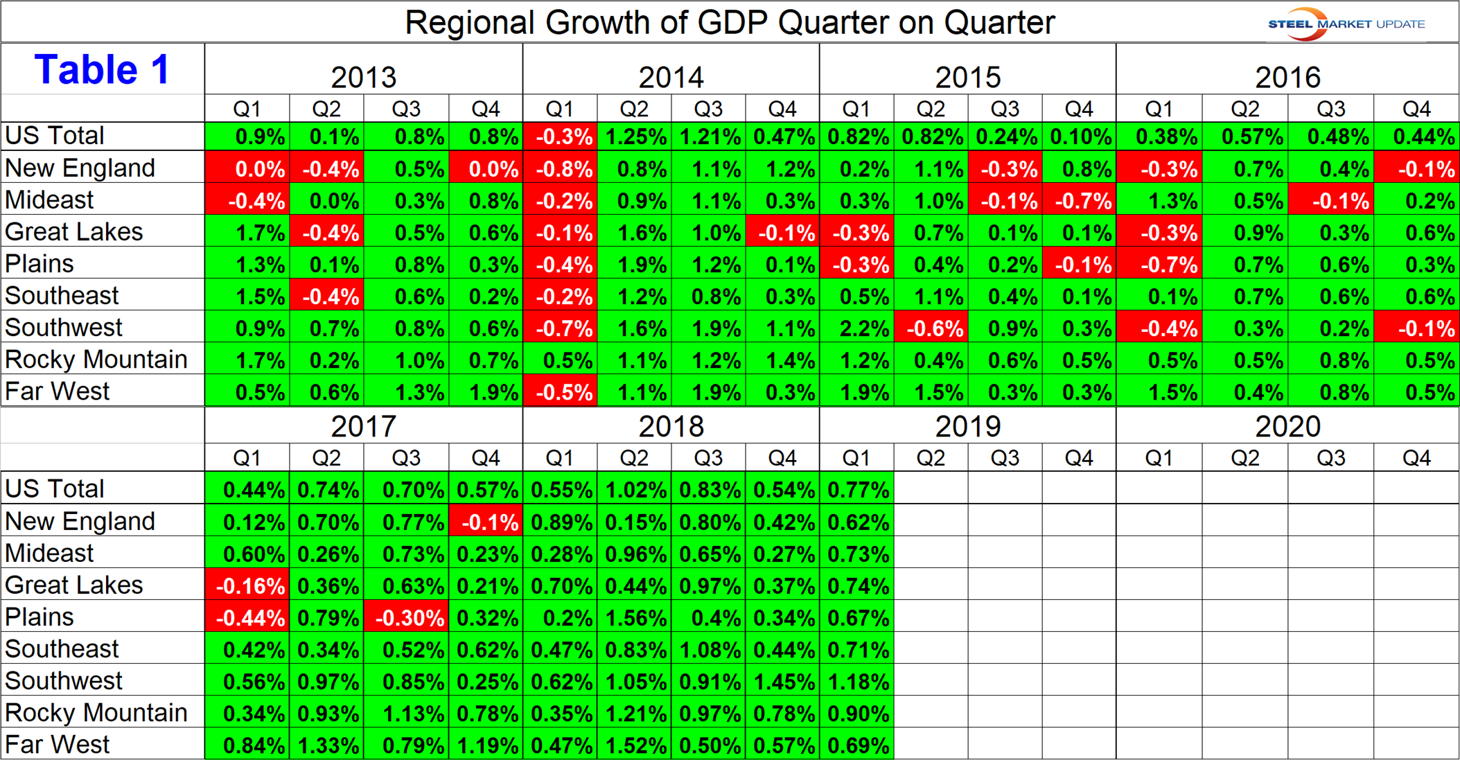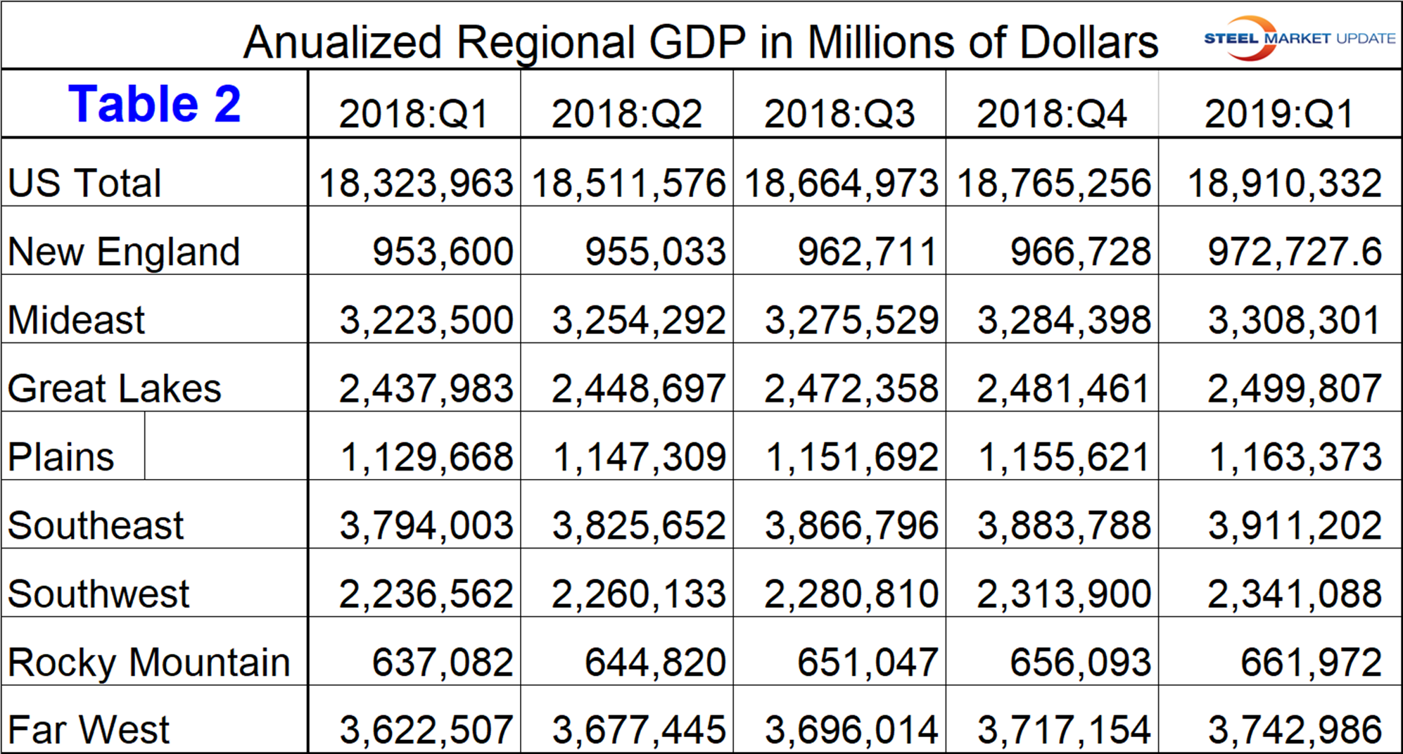 The BEA introduced a new data set for GDP by state and region in 2014 and backdated it to Q1 2005. This week, the data was updated through Q1 2019. Even though this might be considered historically “old,” we think it’s worth reporting because it’s the foundation for where we are now. The data is published quarterly and is reported in chained 2012 dollars seasonally adjusted. Steel Market Update analyzes the data and reports to subscribers quarterly by region. Table 1 shows the growth of regional GDP in chained 2012 dollars quarter on quarter. (These growth numbers are not annualized as opposed to the headline number for the growth of national GDP. Annualized means multiplied by four.) Every region has had positive growth in each of the last five quarters reported with the South West having the highest growth rate in Q4 2018 and Q1 2019.