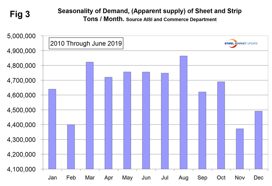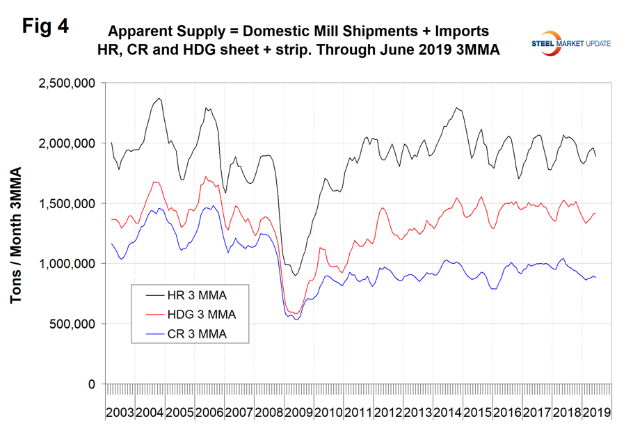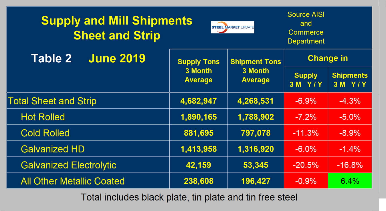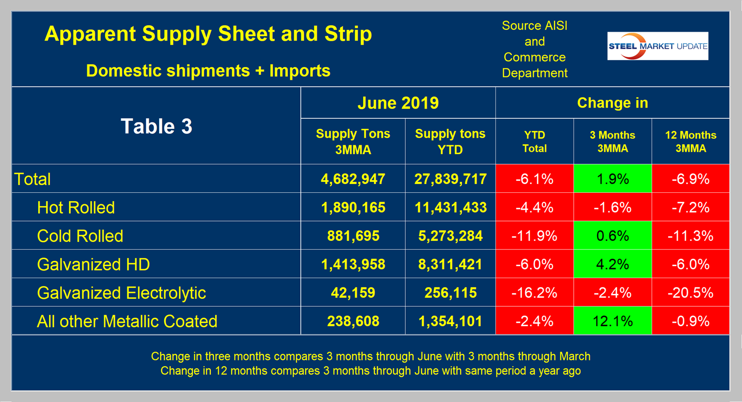 Table 2 describes both apparent supply and mill shipments of sheet products (shipments includes exports) side by side as three-month averages through June with year over year growth rates for each. Comparing the year-over-year time periods, total supply of sheet products to the market decreased by 6.9 percent and mill shipments decreased by 4.3 percent. Table 2 breaks down the total into product detail and shows that supply was down for all five sheet products considered in this report. Cold rolled and electrogalvanized continued to be particularly weak. Domestic mill shipments were down year over year for all products except other metallic coated, which is mainly Galvalume. Apparent supply is defined as domestic mill shipments to domestic locations plus imports. In the three months through June 2019, the average monthly supply of sheet and strip was 4.683 million tons. There is no seasonal manipulation of any of these numbers. By definition, year over year comparisons have seasonality removed.