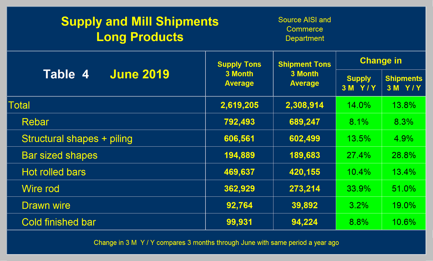This analysis by Steel Market Update is based on steel mill shipment data from the American Iron and Steel Institute (AISI) and import-export data from the U.S. Department of Commerce. The analysis summarizes total steel supply by product from 2003 through June 2019 and year-on-year changes. The supply data is a proxy for market demand, which does not take into consideration inventory changes in the supply chain. Our analysis compares domestic mill shipments with total supply to the market. It quantifies market direction by product and enables a side-by-side comparison of the degree to which imports have absorbed demand.