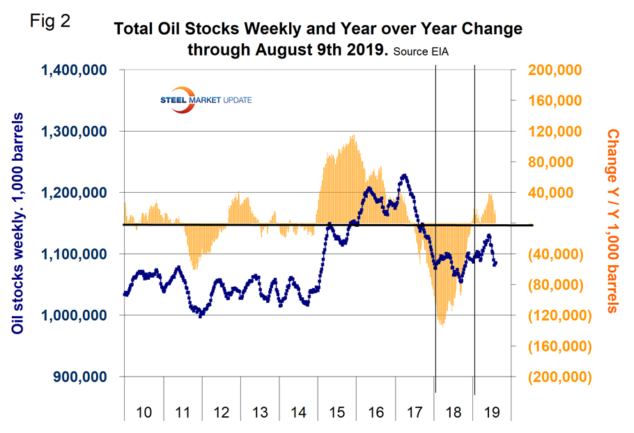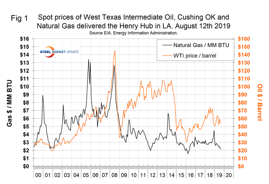 Figure 1 shows historical oil and gas prices from January 2000 through Aug. 12, 2019. WTI had a recent low of $51.14 on Aug. 7 when Brent was $55.03. Our price and inventory data come from the Energy Information Administration. On Aug. 9, natural gas at the Henry Hub in Oklahoma was priced at $2.11 per MMBtu (million British Thermal Units), down 36 cents on the month. Natural gas continues to make inroads against coal as an electric power generator.