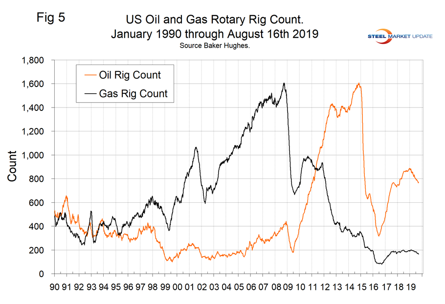 The U.S. gas rig count rose from its low point of 81 on Aug. 5, 2016, to 202 on Jan. 11, 2019, before falling back to 165 on Aug. 16, 2019. The year-over-year growth rate of total U.S. operating rigs was negative 11.5 percent in the latest data with oil down by 11.6 percent and gas down by 11.3 percent. Figure 5 shows the Baker Hughes U.S. Rotary Rig Counts for oil and gas equipment in the U.S. (explanation below).