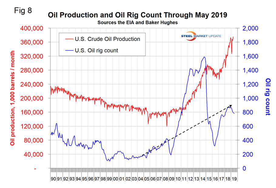 Figure 8 compares oil production and the oil rig count and shows how the increase in exploratory wells drove production from 2009 through late 2014 when the oil price collapsed.